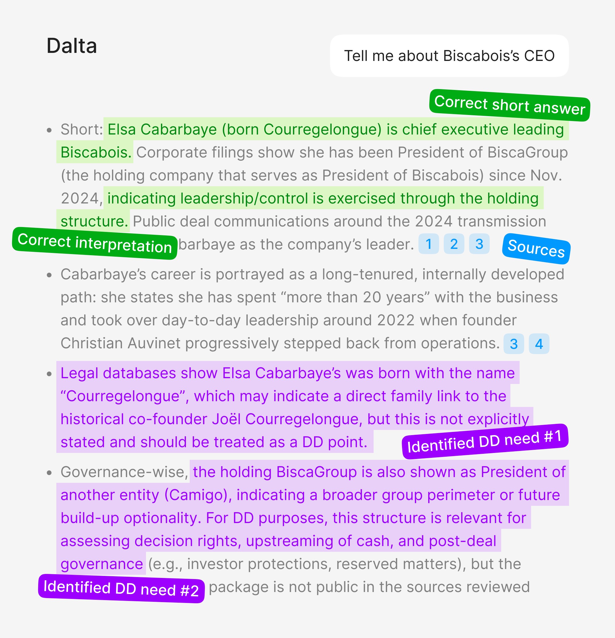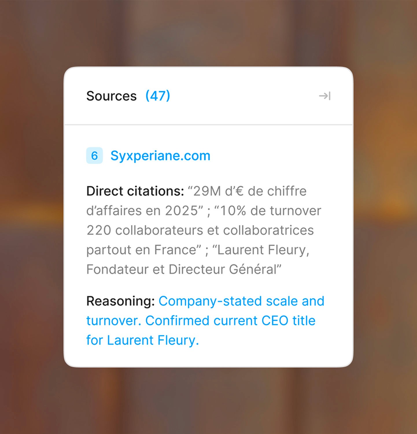 Outputs and sources that are always fully auditable, with reasoning details and direct sources citations.